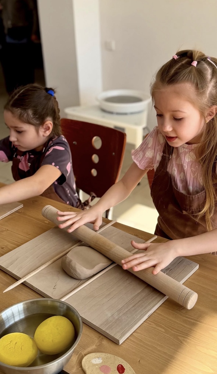 Там такое классное место! Огромные окна, и через них видно парк и речку Кубань. Солнышко светило прямо на столы, и казалось, что мы не в городе, а в каком-то волшебном домике в лесу. Там стояло штук 6 гончарных кругов, а на полках — готовые кружки и тарелки. Такие красивые, что мама даже ахнула и сказала: «Это ж надо, как талантливо». Нас встретил мастер — тетя Марьям. Она сразу сказала, чтобы мы не боялись и что глина любит смелых. И знаете, она реально крутая! Она села за круг и за 1 минуту из простого куска глины сделала вазу. Я даже рот открыла. Она объясняла, что глина — как живая: если её не любить, если ты злишься, она не подчинится, будет кривой. И тут меня осенило! Я поняла, что хочу сделать НЕ просто чашку, а мисочку для моего котенка Буси. Мы его недавно взяли из приюта, он рыжий и пушистый, как маленький лисенок и он сейчас с папой дома(он у нас работает и не смог поехать). Я так по нему скучала, пока мы тут, в Краснодаре! Тетя Марьям сказала: «Отличная идея, давай творить