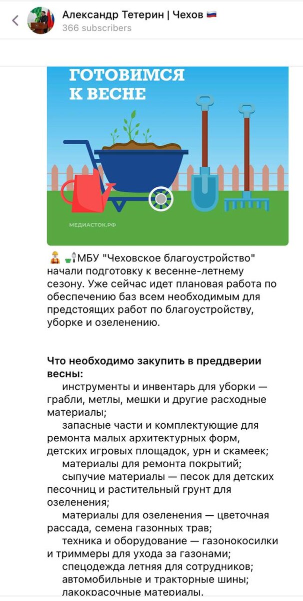 🔥🔥🔥 Заместитель главы Чехова заявил, что муниципальные коммунальщики приступили к закупке вил весеннего инвентаря