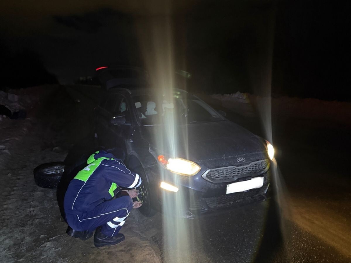 В Орловской области у автомобилиста прямо на дороге пробило колеса. Помочь ему вызвались полицейские. Подробности рассказали в региональном УМВД. Инспектор ДПС Артем Петращук и проходящий практику курсант института МВД Никита Иванов находились на посту на автодороге «Северный подъезд к г. Мценску». На неосвещенном участке трассы они увидели выставленный знак аварийной остановки и машину со включенной аварийной сигнализацией. Инспектор и курсант узнали от водителя о его беде – по пути у машины пробило колесо. Стражи порядка помогли автомобилисту с заменой колеса. После этого он смог продолжить свой путь.