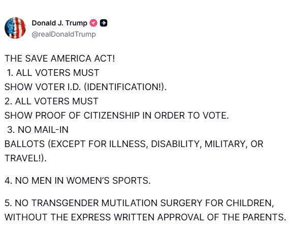Источник: Беспощадный Банкстер Фильтр: — Сообщение: Голосовать в США теперь можно будет только с удостоверением личности и подтверждением гражданства, объявил Трамп. Голосование по почте запретят, разрешат лишь в случаях болезни, инвалидности, поездок или военной службы. Такими он представил пункты нового «Закона о спасении Америки». @bezposhady Перейти к оригиналу