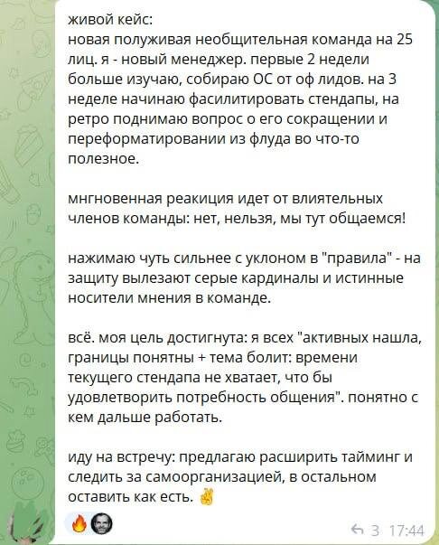 Если вы понимаете что происходит. В прошлом году в мастерской по лидерству участница - руководитель команды на 25 человек рассказала, как диагностирует новую команду. Она приходит, две недели наблюдает. А потом на ретро поднимает нарочно спорную тему. Скажем, предлагает сократить стендап. Тему, где результат ей не важен. Важна реакция. Кто молчит. Кто взрывается. Кто защищает статус-кво. Кто прячется за других 👀. За один разговор она находит серых кардиналов, реальных носителей влияния и скрытые линии напряжения. Это не манипуляция. Это диагностика. В современном мире многое меняется, но кое что нет ) Руководители делятся на два типа. Тип 1 😰 избегают конфликтов. Откладывают сложные разговоры. Надеются, что «само рассосется». Что-то действительно рассасывается , а что-то копится. Интуиция накапливает опыт что игнорирование проблем работает. Но то что копится в какой-то момент взрывается так, что останавливает работу на недели. Тип 2 🧠 используют конфликт, как инструмент. Не