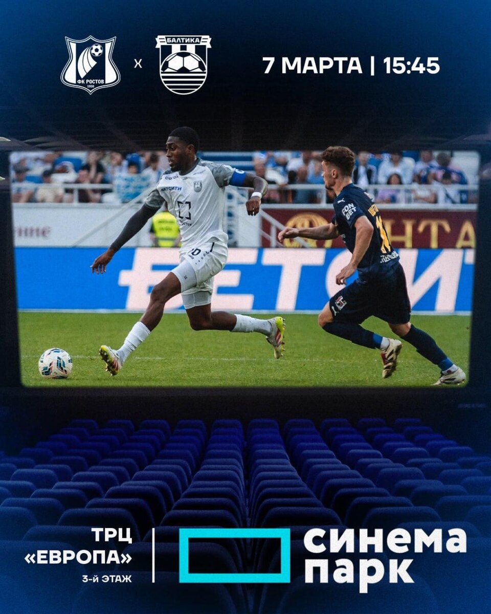 » 💙 Гостевой матч нашей команды в рамках следующего тура Российской Премьер-лиги снова можно посмотреть в кинотеатре «Синема Парк» в ТРЦ «Европа»! «Ростов» 💙 — 💙 «Балтика» 📆 7 марта; ⏰ 15:45; Приятная компания на просмотр матча гарантирована! 🎟️ БИЛЕТЫ В КИНОТЕАТР