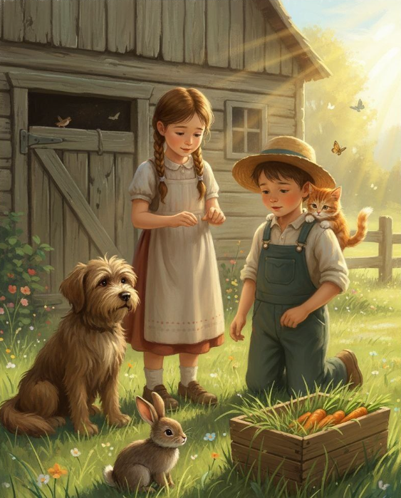 Артём осторожно положил рядом с зайчонком кусочек морковки и листик капусты, которые они принесли из дома. Дружок и Мурка тоже подошли, но вели себя очень спокойно, будто понимали, что зайчонку страшно.