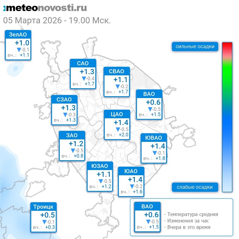 В 19:00 в Москве было от +0.1°C до +2°C, средняя температура +1.2°C #погода #Москва #весна #температура #5марта #четверг