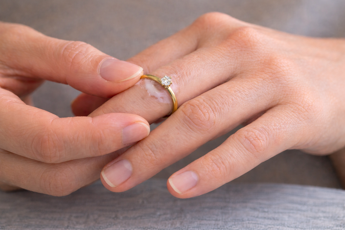 Бывает так, что пальцы отекают — и кольцо вдруг отказывается сниматься. Или просто со временем стало маловато. Не надо тянуть и мучиться. Нанесите капельку кондиционера вокруг кольца, чуть покрутите — и оно мягко соскользнёт.