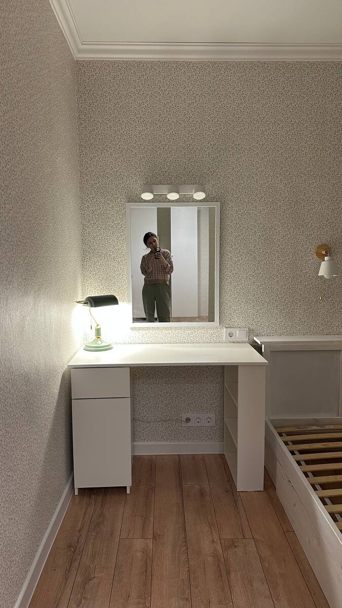 Всем привет!) картинка потихоньку складывается. Коля почти доделал плинтуса, сделал полочку у изголовья кровати и столик собрал)