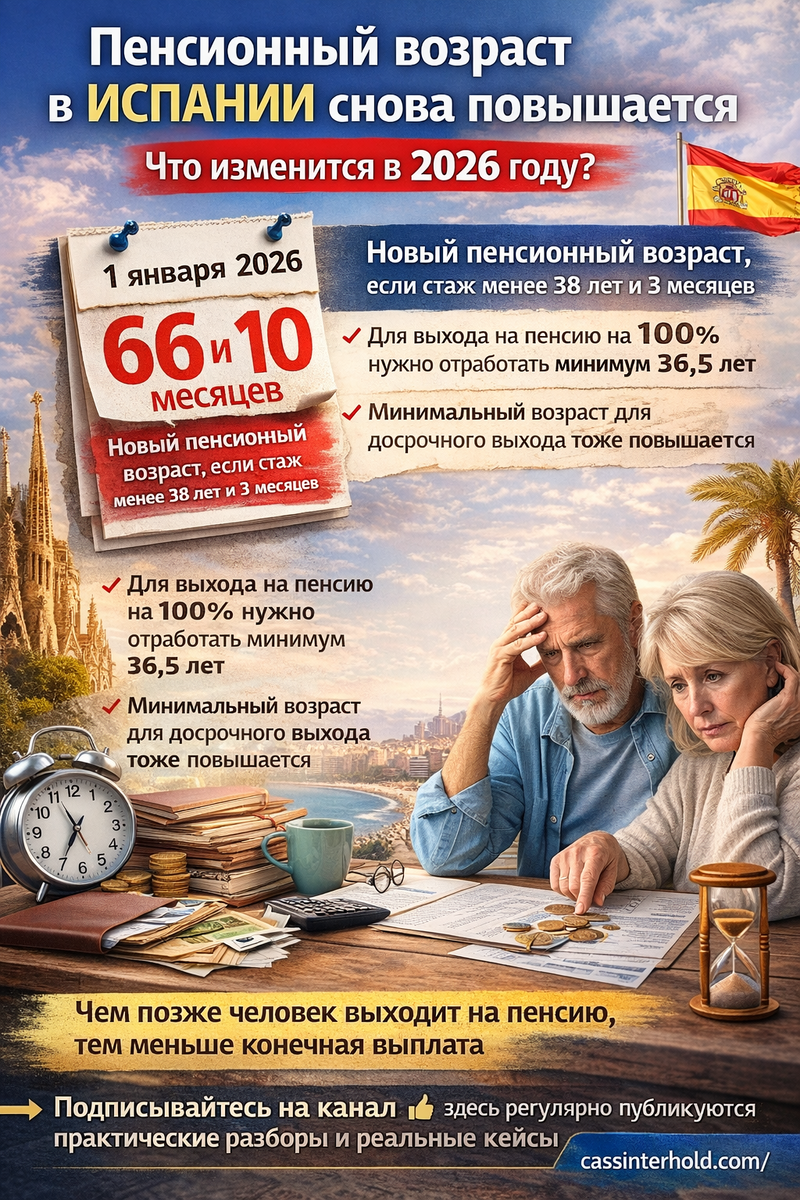 Фактически реформа означает одно: многим людям придётся работать дольше, чем они рассчитывали ранее. Согласно обновлённому графику реформы, стандартный возраст выхода на пенсию в Испании в 2026 году составит: 66 лет и 10 месяцев Это правило будет применяться к тем, чей страховой стаж меньше 38 лет и 3 месяцев. Однако существует исключение. Если человек накопил 38 лет и 3 месяца стажа или больше, он сможет выйти на пенсию в 65 лет, как и раньше. Проблема в том, что выполнить это условие становится всё сложнее. Сегодня многие люди сталкиваются с: Поэтому набрать почти 40 лет страхового стажа удаётся всё меньшему количеству работников. Одновременно с повышением общего пенсионного возраста увеличивается и минимальный возраст для досрочного выхода на пенсию. Это означает, что привычная схема «уйти на несколько лет раньше» становится менее доступной. Даже если человек имеет достаточный стаж, досрочный выход сопровождается понижающими коэффициентами, которые уменьшают размер будущей пенсии. Ч