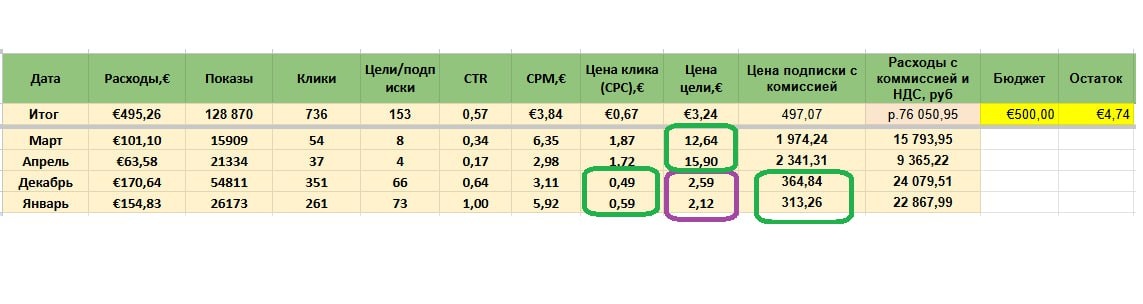 Весной прошлого года я начала работать с проектом в бизнес-тематике. Мы запускали трафик на канал клиента: сначала тестировали посевы, потом Telegram Ads. На проекте я отвечала за стратегию привлечения трафика, гипотезы и воронки, второй специалист - за креативы и рекламный кабинет. То есть мы смотрели на проект через трафик, закупку и то, как привести подписчика по нужной цене. Первая попытка не зашла. Подписчик выходил слишком дорогим: в среднем 1,97–2,3 тысячи рублей 🙈 Цена клика держалась на уровне 1,58–1,87 евро. Стало понятно, что если так продолжать, это будет просто сжигать бюджет. Поэтому работу остановили. Через полгода мы вернулись к проекту. Во второй раз зашли в него не только со стороны трафика, а как маркетологи. Пересобрали всю связку проекта: пересмотрели канал, собрали новые гипотезы, сделали три воронки, переписали посты под посадку. Добавили то, что в бизнес-тематике сильно влияет на доверие: статьи, интервью, подкасты, публичные выходы. И отдельно докрутил