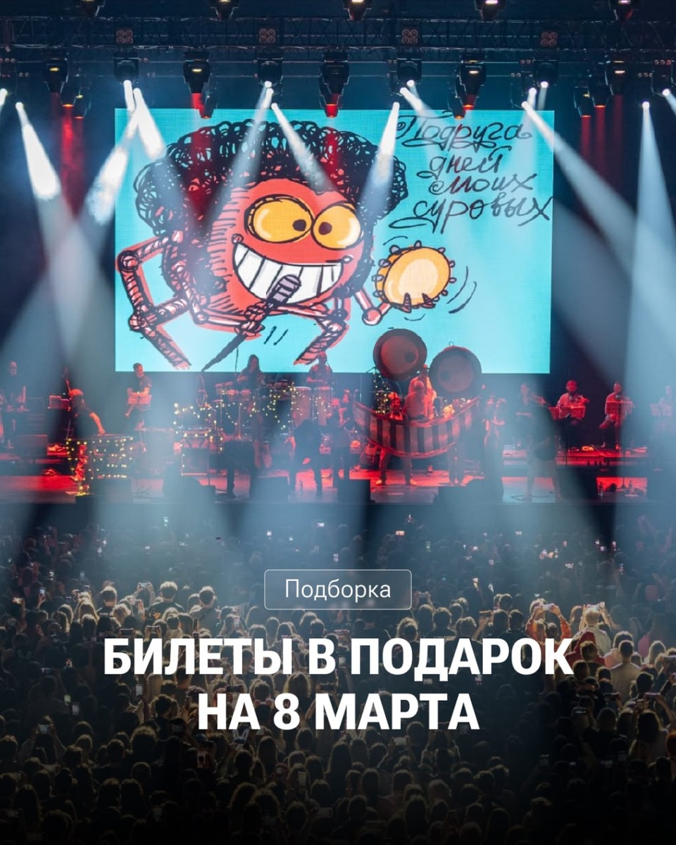 ? Цветы завянут, конфеты закончатся, а вот билеты на концерт — это воспоминание. Если вы в Ростове-на-Дону, советуем поторопиться и взять билеты на концерт СмешBandа. Актёры озвучки и композиторы «Смешариков» исполнят любимые песни из того самого мультсериала, который знают и дети, и взрослые. Если вы в Петербурге, ещё можно успеть на концерты NILETTO или Полины Гагариной. Ещё больше идей 👉 в карточках. Все билеты 👉 KASSIR.RU 🙏KASSIR.RU есть в MAX. Подписывайтесь! ✅