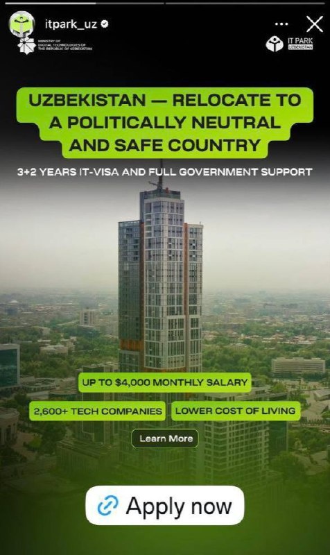 Источник: Беспощадный Банкстер Фильтр: — Сообщение: Узбекистан начал заманивать айтишников из стран Ближнего Востока. На фоне ракетных ударов по Катару и ОАЭ страна запустила рекламную кампанию для специалистов, которым нужно безопасное убежище. Обещают нейтральную обстановку, много технологических компаний и невысокую стоимость жизни. Зарплаты для IT‑специалистов доходят до $4000. @bezposhady Перейти к оригиналу
