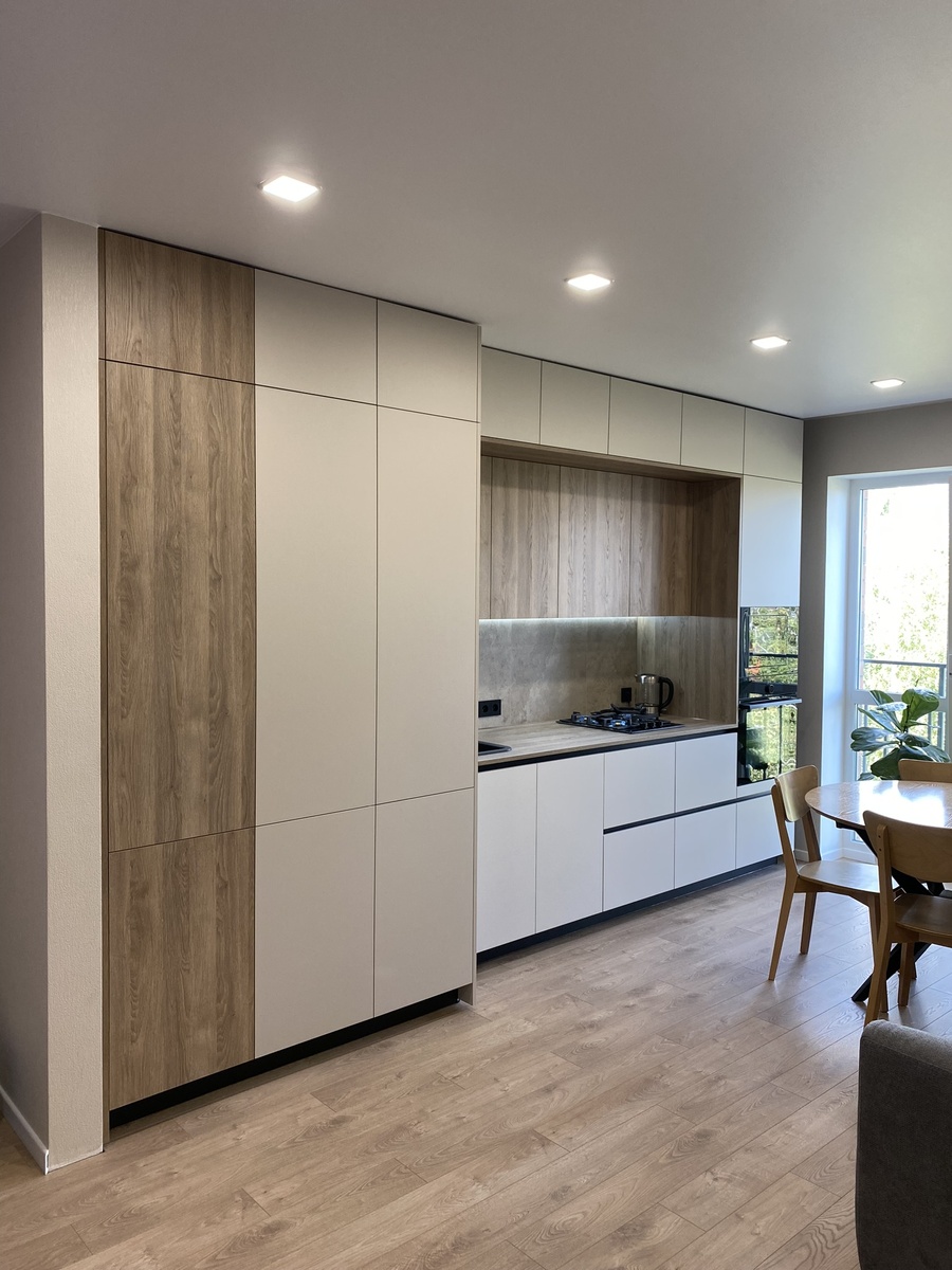 - Учитывайте фактуру фасадов (матовая, шпонированная, текстурированное стекло).