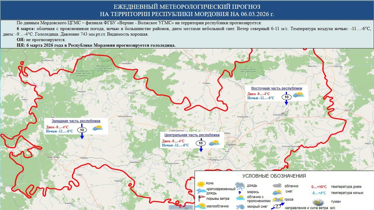 ☁️⛅⛈️ 6 марта в Мордовии облачная с прояснениями погода, ночью в большинстве районов, днем местами небольшой снег, гололедица