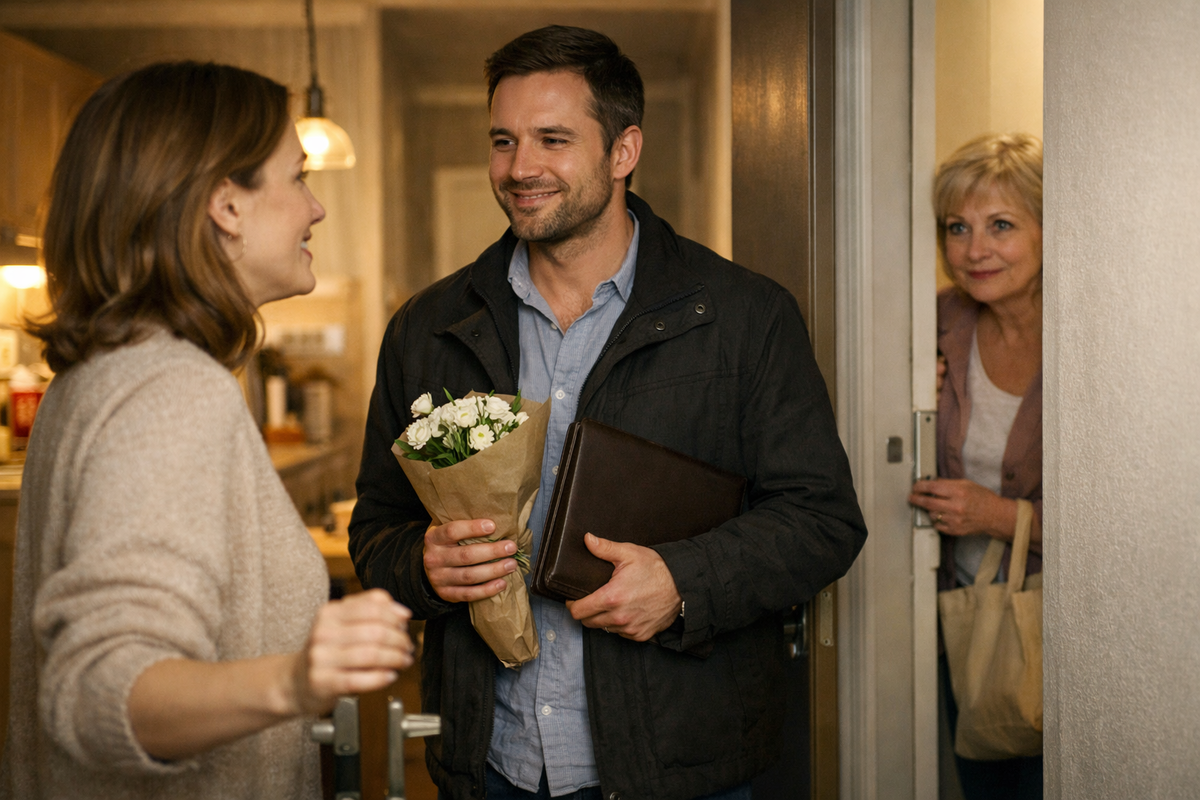 На пороге стоял молодой мужчина. За ним — ещё один, выше ростом, молчаливый, словно сопровождающий.