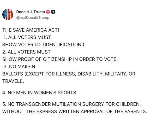 ". 📍Все избиратели для голосования должны предъявлять удостоверения личности и иметь подтверждение американского гражданства. 📍Запрещается голосование по почте, за исключением случаев болезни, инвалидности, поездок или военной службы. 📍Трамп также заявил, что мужчины не должны соревноваться в женских видах спорта, а все операции по смене пола* детей должны проводиться только с письменного разрешения родителей. Вроде вполне здравые инициативы. Что смущает? Название. Ви первую очередь. Во - вторую - тенденция. Поясню. 24 марта 1933 года в Германии приняли "Закон о преодолении бедственного положения народа и государства". Он дал полноту власти нацистам, перевернул Конституцию и стал основой диктатуры, которая рухнула лишь в мае 1945 года, забрав с собой десятки миллионов жизней. *Движение ЛГБТ признано экстремистским и запрещено на территории России. 🇷🇺 Николай Стариков 🇷🇺 в MAX 📖 Школа Геополитики → теперь и на sponsr.ru/nstarikov 🔥