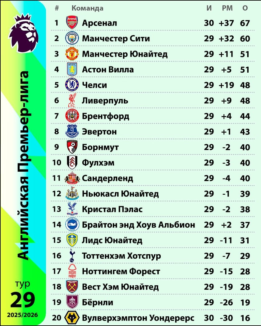 Турнирная таблица АПЛ после 29-го тура