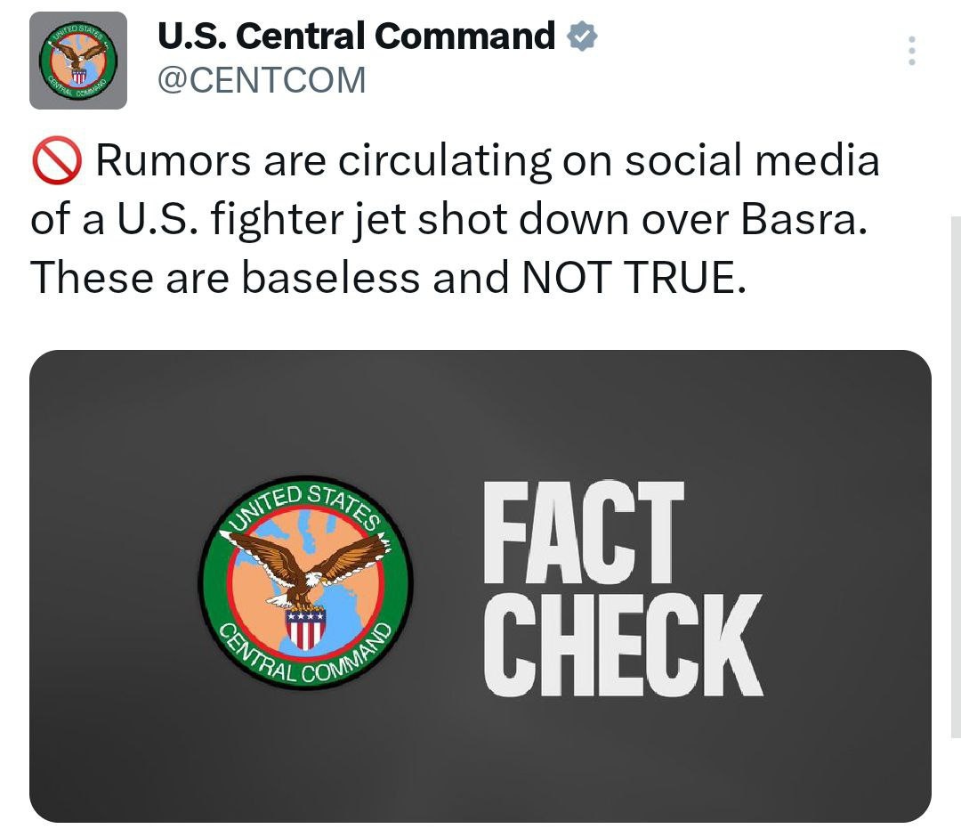 CENTCOM DENIES reports of US jet shot down over Iraq's Basra