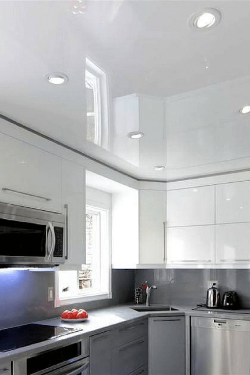 - Яркие и тёмные потолки в маленькой кухне быстро утомляют и «давят», лучше избегать.