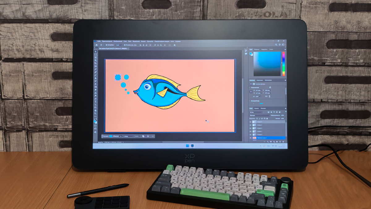 Чтобы проверить XPPen Artist Pro 24 (2-го поколения) в работе, мы запустили графический редактор Adobe Photoshop. Прежде всего хотелось бы отметить чёткость изображения на экране и хорошую цветопередачу. Благодаря антибликовому покрытию пользоваться дисплеем комфортно даже при ярком освещении.