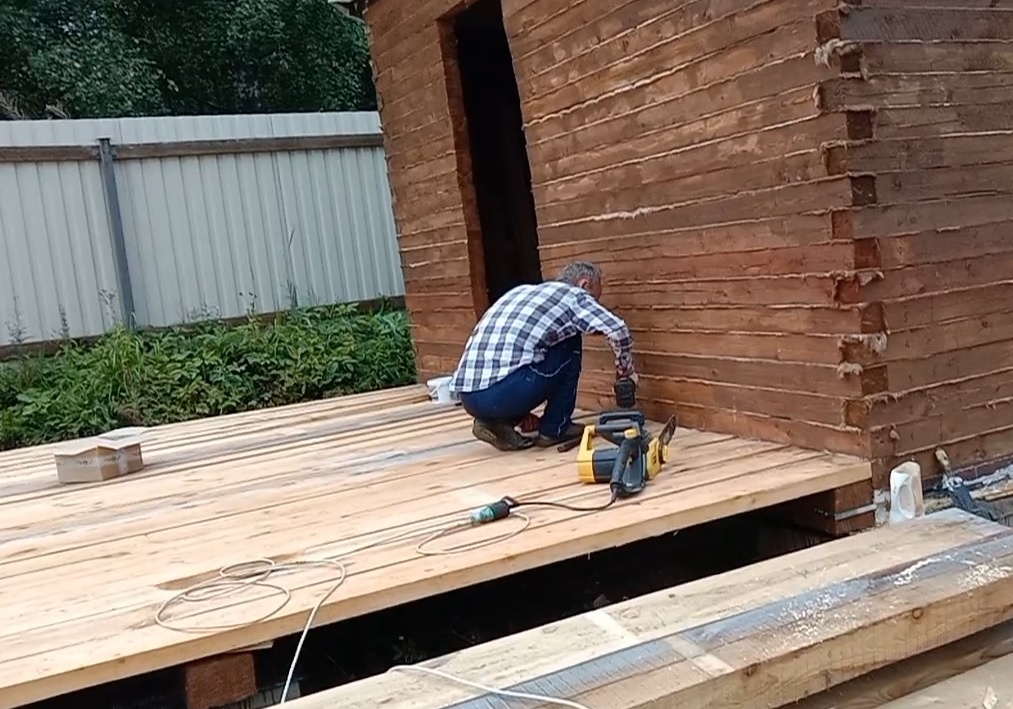 К бане мы решили пристроить веранду. После разметки были выкопаны ямы на нужный уровень по лазерному нивелиру. Из фундаментных блоков 200*200*400 мм собираем столбы, каждый из 8 блоков - это 4 ряда. Через неделю когда раствор набрал необходимую прочность наносим мастику поверх столбов и сверху слой гидростеклоизола. Далее на фундаментные столбы укладываем брус 150*150 мм ,который предварительно обрезаем на нужную длину. После этого собираем пол из обрезной доски 200*50 мм.