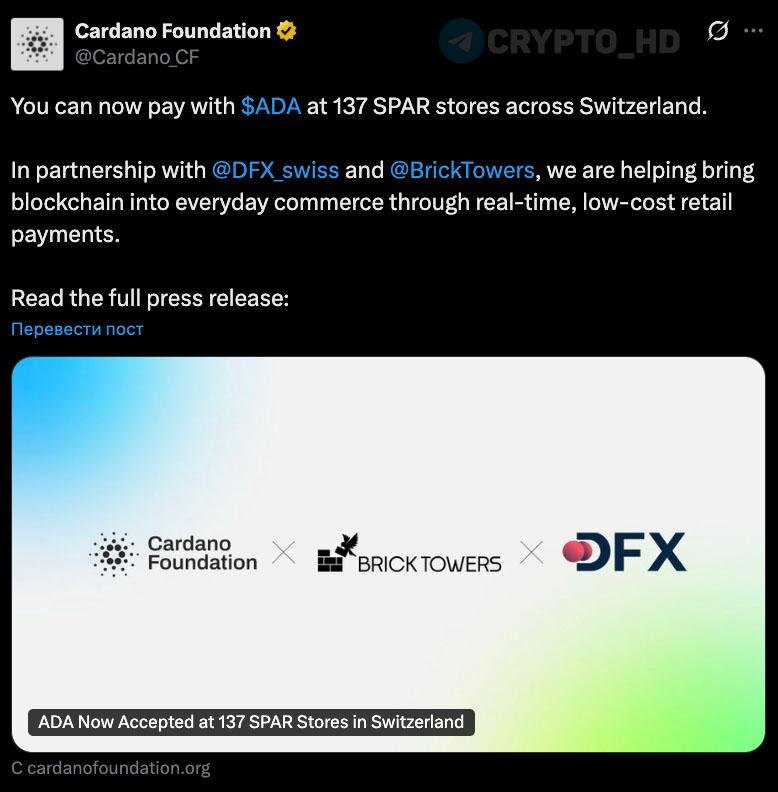 🇨🇭 #ADA Cardano теперь можно использовать для оплаты товаров в 137 магазинах Spar по всей Швейцарии – релиз