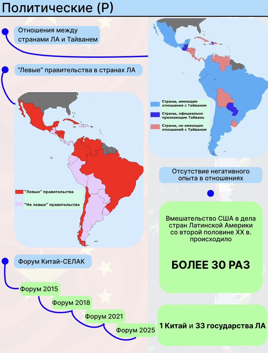 В последние годы Китай играет всё более заметную роль в Латинской Америке. Для большинства стран региона он выступает уже не просто как экономический партнёр, а как стратегически важный союзник. Но в чём выражаются взаимоотношения Китая и стран региона? В соответствии с техникой PEST-анализа, выделены четыре типа факторов, которые определяют роль КНР в регионе: политические, экономические, социальные и технологические. Политические факторы Одним из ключевых аспектов политики Китая в Латинской Америке является его участие в работе региональных объединений, прежде всего в деятельности Сообщества государств Латинской Америки и Карибского бассейна за счёт форума CELAC-Китай, который с момента своего создания проводился уже 4 раза: в 2015, 2018, 2021 и 2025 гг. Этот формат служит площадкой для расширения политического влияния Китая и формирования совместных стратегий между ним и латиноамериканскими странами, прежде всего со странами, в которых у власти находятся «левые» правительства, с кот