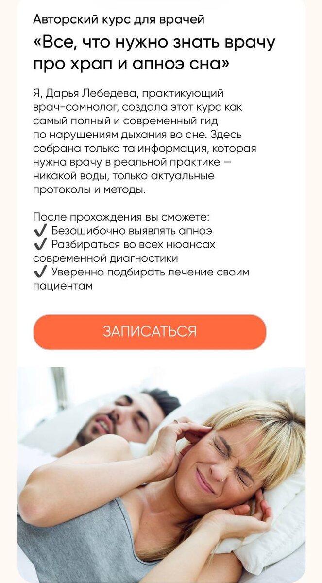 Им очень хочется углубиться в эту тему, узнать больше практических моментов, клинических случаев, секретов, как работать с пациентами, расширить знания по особенностям подбора СИПАП-терапии, узнать нюансы в общении со сложными пациентами, погрузиться в необычные случаи. И я поняла — нужен новый обучающий курс. Для себя я его назвала «Апнология для продвинутых» или «Все, что нужно знать врачу про храп и апноэ». Курс собран специально для тех врачей, которые уже знают основы апнологии и респираторной медицины, но хотят погрузиться в тему еще глубже. В этот курс я добавила, кроме лекций лор-врача и психотерапевта, также лекцию профессора-пульмонолога Сергея Львовича Бабака. И кусочек этой лекции можете посмотреть в этом видео ⬆️ Интересно? Тогда всех приглашаю ко мне на обучение! 🔗 ЗАПИСАТЬСЯ НА КУРС #курсыдляврачей