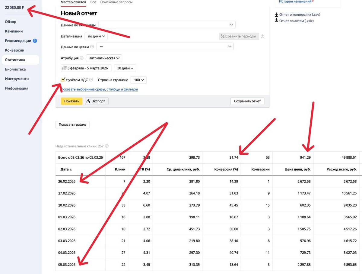 ?" Мы дали ему рекомендации и говорим, что вначале надо пополнить рекламный бюджет не на 10-15 тысяч, а на все 40, и потом главной целью сделать постепенное его доведение до несгораемых 100 на балансе. Клиент доверился нашему мнению и вот результат на новом аккаунте в Москве, ремонт стиральных машин и холодильников. Значит ли это, что если такой возможности нет - реклама превратится в тыкву? Нет, просто скорее всего обращения будут в 1,5 раза дороже и во столько же реже. Экономика все равно будет в разы выгоднее, чем при работе на агрегаторов, а качество обращений будет в разы выше, чем на авито. Не обязательно с первого пополнения класть так много, просто конкретно тут была и возможность, и запрос. А какова, однако, статистика! 53 целевых обращения (чат или звонок) по цене до 1000 рублей в 2026-м году в Москве за неделю, да еще и с высокой конверсией. На скриншоте выделил самые важные моменты стрелками. Поэтому, если есть возможность обрабатывать много заявок - пишите, вот такие р