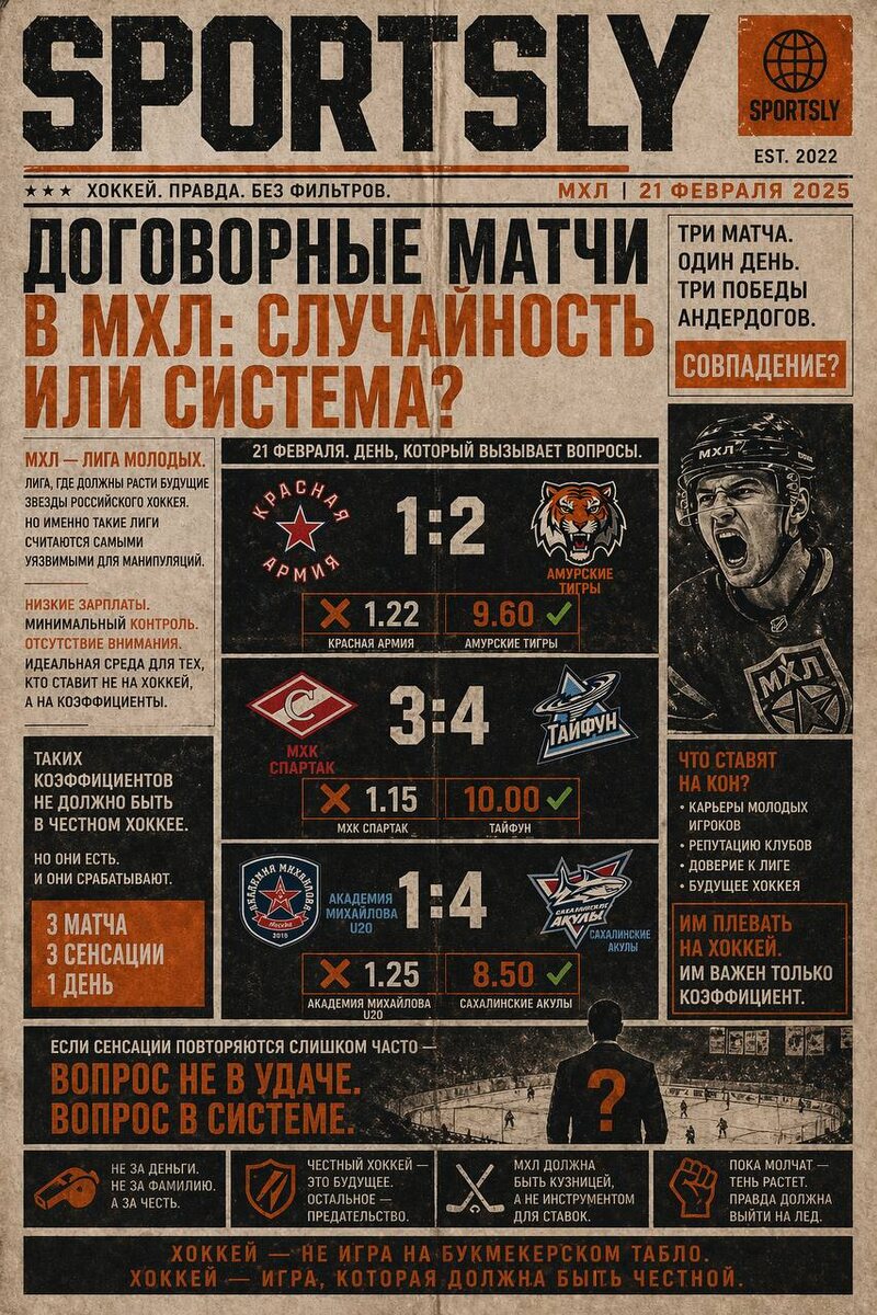 Но сразу расставим точки над i. Речь не идет про НХЛ, не про КХЛ и даже не про топовые европейские чемпионаты. Там слишком большие деньги, слишком серьезный контроль и слишком высокая цена репутации. Мы говорим о более приземленном уровне. О МХЛ. Лиге, где играют будущие звезды российского хоккея. Лиге, которая должна быть кузницей талантов. Лиге, где 18-летние пацаны делают первые шаги к профессиональной карьере. И именно такие лиги во всем мире считаются самыми уязвимыми для манипуляций. Низкие зарплаты. Минимальный контроль. Почти полное отсутствие общественного внимания. Идеальная среда для тех, кто умеет зарабатывать на спорте, не имея к спорту никакого отношения. День, который вызывает слишком много вопросов 21 февраля в МХЛ состоялось несколько матчей, которые на первый взгляд выглядят обычными. Но если посмотреть на коэффициенты букмекеров перед этими играми — картина начинает выглядеть совсем иначе. В этот день сразу три явных фаворита проиграли, а коэффициенты на побед