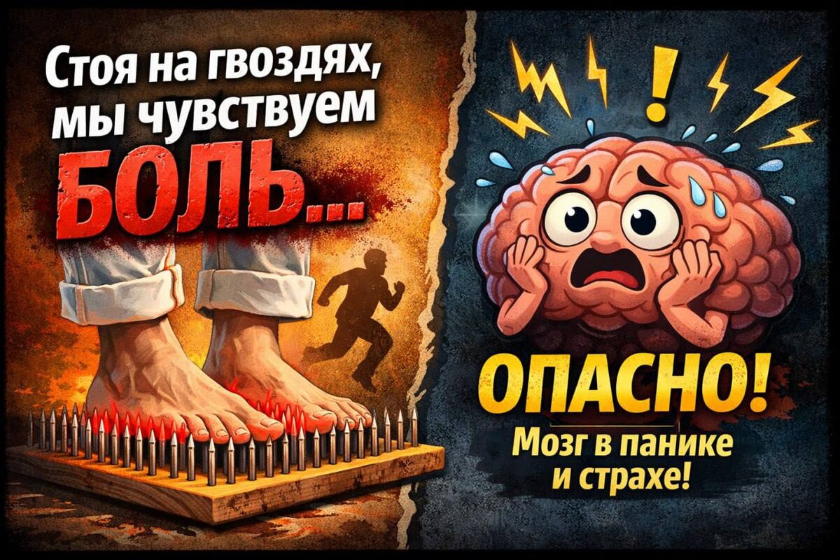 естественно, большая часть людей скажет: мы чувствуем боль. И будут правы. Они, действительно, чувствуют боль, но есть одно существенное дополнение ко всему этому. Наш мозг боится. Да, ему страшно. Ну точнее одному из отделов, который отвечает за гомеостаз т.е. постоянство внутренней среды. И этот отдел как будет пытаться спасти весь организм? Правильно! Посылая сигналы бедствия в другие зоны мозга, чтобы активировать мышцы для побега с этих самых гвоздей. А как сделать так, чтобы убедить остальные зоны мозга, что ситуация действительно патовая и надо как можно быстрее навострить лыжи к выходу? Обличить свой баннальный страх в боль, а это уже воспринимается как нечто серьезное и доходит значительно быстрее. Причем для огромого количество людей практика гвоздестояния (как и массажа, кстати) это про страх потери контроля. Такие люди привыкли, что их жизнь постоянно под контролем, они держат руку на пульсе, находясь на чеку. И смех и грех, ей богу... Добираясь каждый день из дома до раб