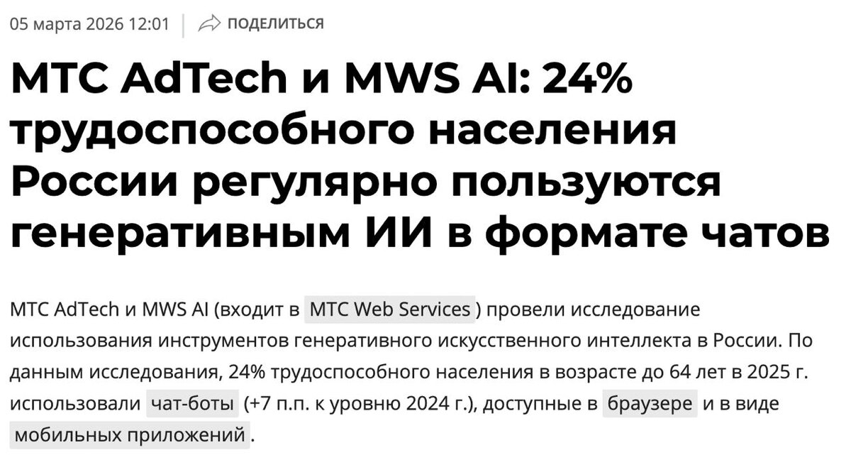 ! Российские нейронки пользуются популярностью — 52% трудоспособного населения, использующего ИИ, выбирают отечественные сервисы В целом, по данным исследования МТС AdTech и MWS AI, сегодня каждый четвертый россиян трудоспособного возраста на постоянной основе использует чаты с ИИ. Самой популярной нейросетью по числу пользователей в 2025 году стала Алиса AI. Далее расположились DeepSeek, ChatGPT, GigaChat, Gemini и Perplexity. ИИ отечества нам сладок и приятен ? ❤️ кто я? | закрытый чат по ИИ | курс по ИИ