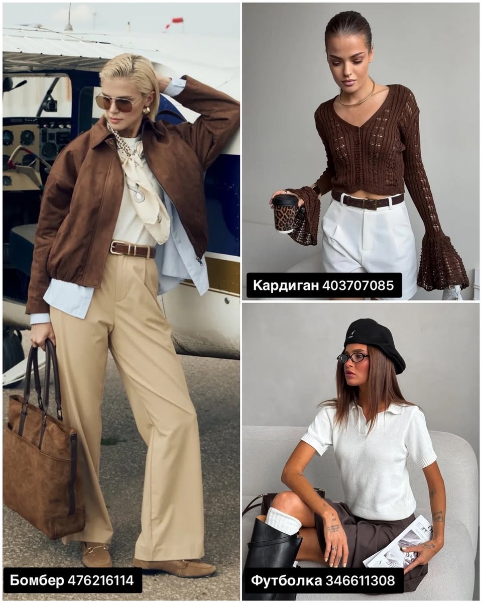 Самые стильные образы всегда построены на простом принципе: спокойная палитра, выразительная фактура и правильные пропорции. На фото — именно такие комплекты: бомберы с мягкой посадкой, тренч с архитектурными плечами, трикотажные футболки с воротником и кардиган с ажуром, который играет на свету. Эти вещи не требуют сложной стилизации — они сами собирают силуэт, а вам остается только добавить обувь, сумку и пару точных аксессуаров.