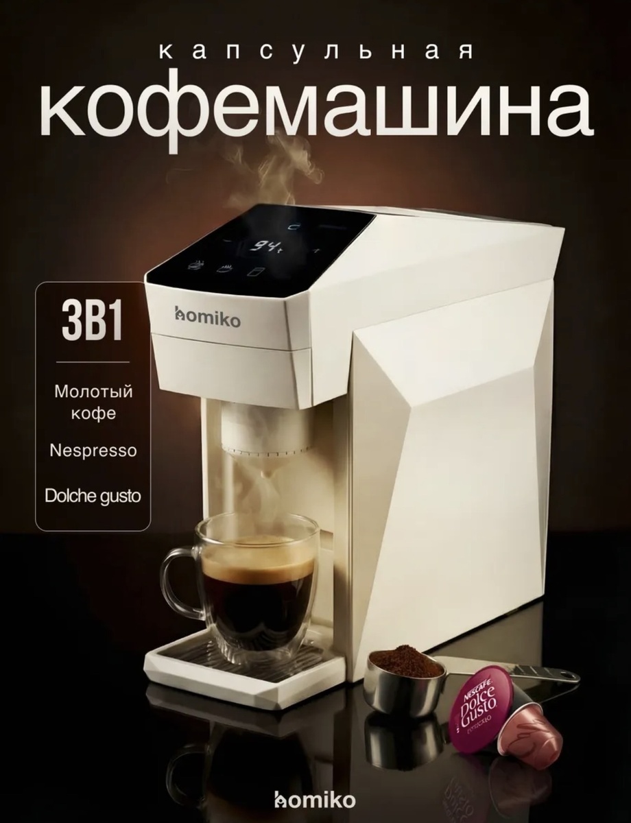 Кофемашина Homiko 3 в 1 сочетает стильный минималистичный дизайн и функциональность премиум-класса. Она совместима с капсулами Nespresso, Dolce Gusto и молотым кофе — можно выбирать формат напитка под настроение.