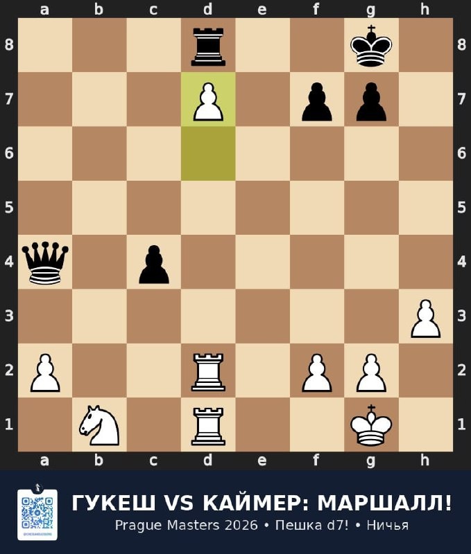 ! Prague Masters 2026, тур 8. Чемпион мира Гукеш (2754) белыми против Винсента Каймера (2776). Каймер выбрал легендарную атаку Маршалла — жертву пешки e5 ради мощной инициативы. План чёрных нестандартный: вместо обычных Сd6/Сf5, Каймер толкает пешку «а» до a3, разрушая ферзевый фланг. 🔑 Ключевые моменты: • 8...d5! — Маршалл на доске • 17...Сxd4! — вскрытие центра • 20. Сxh7+! — классический удар • 37. d7! — пешка на 7-м ряду! Но Каймер хладнокровно блокирует проходную: Крf8 → контроль поля d8. Гукеш не находит пробой — ничья повторением на 47-м ходу. Разбор: lichess.org/study/K3IGgk2c/F95Y7u4z