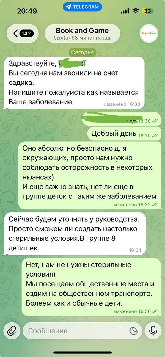Хочу написать об инциденте, который произошел с детским центром развития book&game находящимся по адресу Новое шоссе 5. Я считаю, что о таких случаях должна знать общественность и в частности родители, которые отводят в данный центр своих детей. Хотели записаться в данный центр в детский сад. Созвонились с администратором нас сразу же записали. И по телефону я решила уточнить, несколько моментов. Дело в том, что у нас редкое генетическое заболевание, которое в силу своих особенностей, требует соблюдения строгих мер гигиены, а именно проследить, чтобы после посещения туалета руки были вымыты, во время слива туалета крышка туалета чтобы была закрыта и чтобы были помыты руки перед едой. В обязанности воспитателя частного сада и так это входит. Просто я решила сделать на этом акцент, так как для нас это важно. И мне отказали в посещении. Сначала сказали, что воспитатель может не уследить, ведь она одна а детей много. И вообще у нас детский сад очень маленький, у нас и так 8 человек в групп