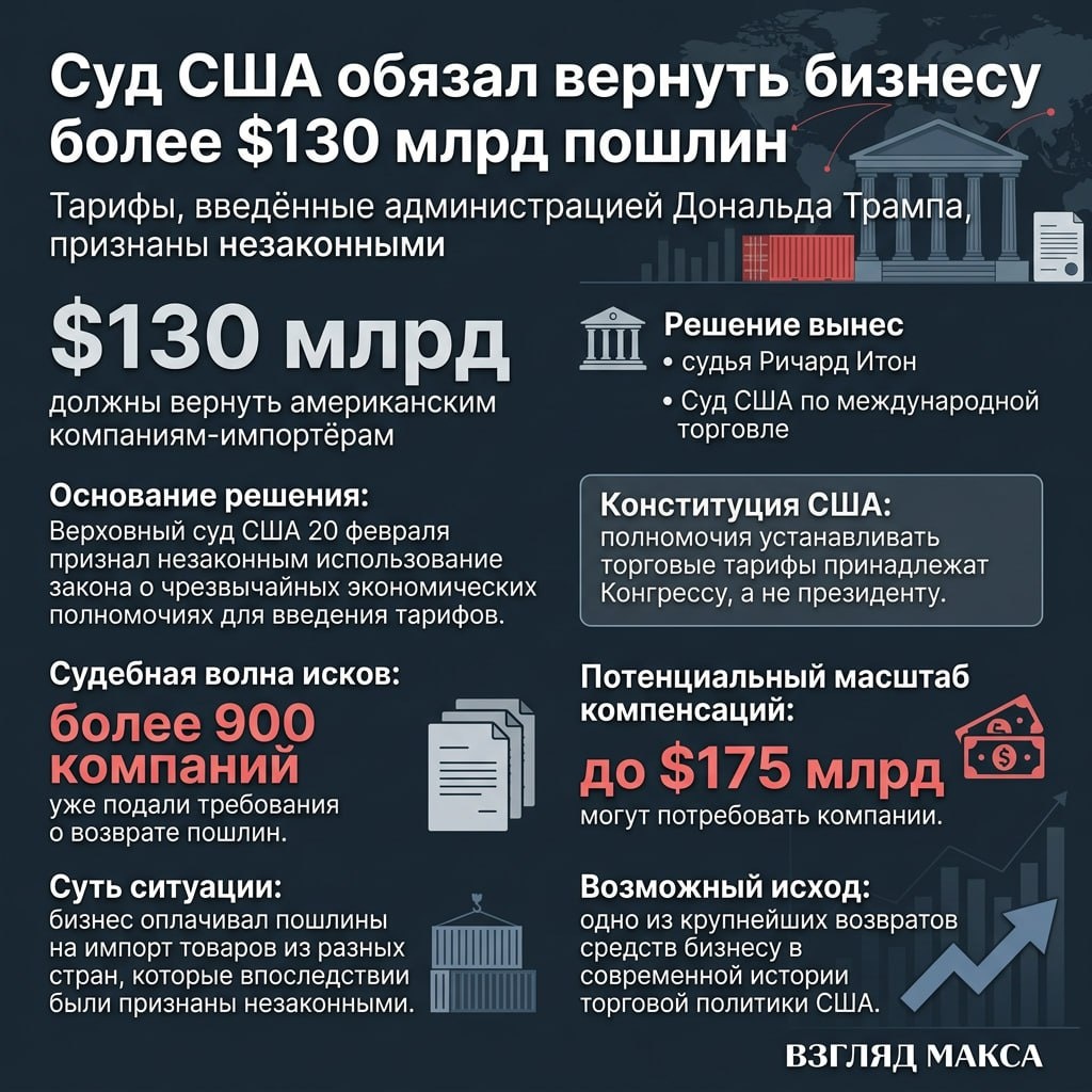 ранее выплатили эти средства в виде пошлин, введённых президентом Дональдом Трампом. Соответствующее решение вынес федеральный судья Ричард Итон. Суд постановил, что Таможенно-пограничная служба США должна вернуть деньги компаниям, уплатившим пошлины в рамках торговой политики администрации Трампа. Решение связано с вердиктом Верховного суда США от 20 февраля, который признал незаконным использование закона о чрезвычайных экономических полномочиях для введения импортных тарифов. Верховный суд указал, что президент не обладает правом вводить такие пошлины в одностороннем порядке. Согласно Конституции США, исключительные полномочия в сфере установления торговых тарифов принадлежат Конгрессу. В решении торгового суда подчёркивается, что все зарегистрированные импортёры имеют право воспользоваться постановлением Верховного суда и требовать возврата средств, уплаченных по признанным незаконными тарифам. Судья Итон своим распоряжением фактически запустил процедуру возврата средств компан