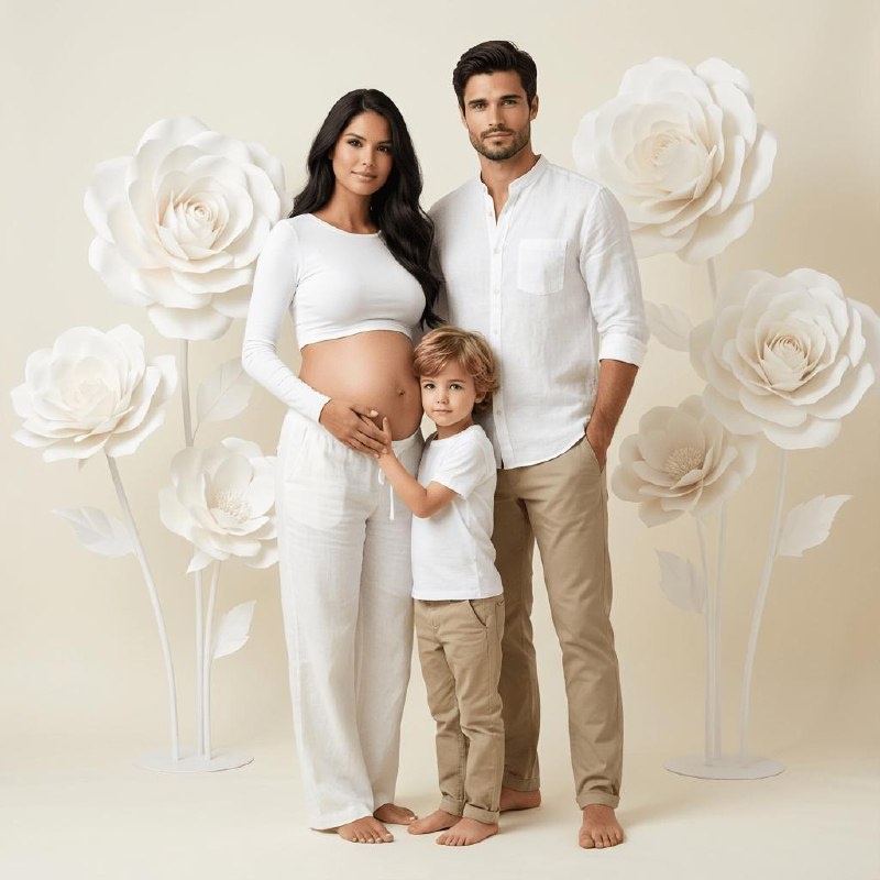 Модель: Nano Banana Сгенерировать🪄 Используй лица людей с загруженных фото. Важно: Не меняйте и не искажайте лица. Не меняйте выражения лиц. Лица должны быть сохранены полностью, как на оригинальных фотографиях. Используйте черты лица и сходство с предоставленными эталонными изображениями. Создайте обстановку вокруг них, но сохраняйте их лица идентичными. Подсказка: Портрет семьи из трех человек, включая беременную мать, отца и сына, в полный рост, которые стоят рядом и смотрят прямо в камеру. Портрет выполнен в полный рост, в рамке на уровне глаз. Все члены семьи ходят босиком. На отце белая свободная рубашка с воротником-стойкой и брюки цвета хаки. На матери простой белый топ с длинными рукавами, открывающий ее беременный живот, и свободные белые брюки. Сын одет в белую футболку и брюки цвета хаки, его голова прижата к беременному животу. Профессиональная фотостудия в помещении на фоне светло-кремового фона, украшенного несколькими огромными скульптурными цветами из белой бумаги. М