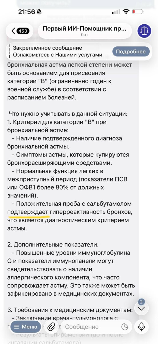 Друзья, очень просто. Копирую вопрос из чата: Здравствуйте, а с бронхиальной астмой легкой степени(положительной пробой с сальбутомолом) повышенными анализами как иммуноглобулин G и повышенные показатели иимунопанели, какую категорию можно получить? Ответ получил за 1 минуту ⬆️ И вы так можете: @A_P_help_bot