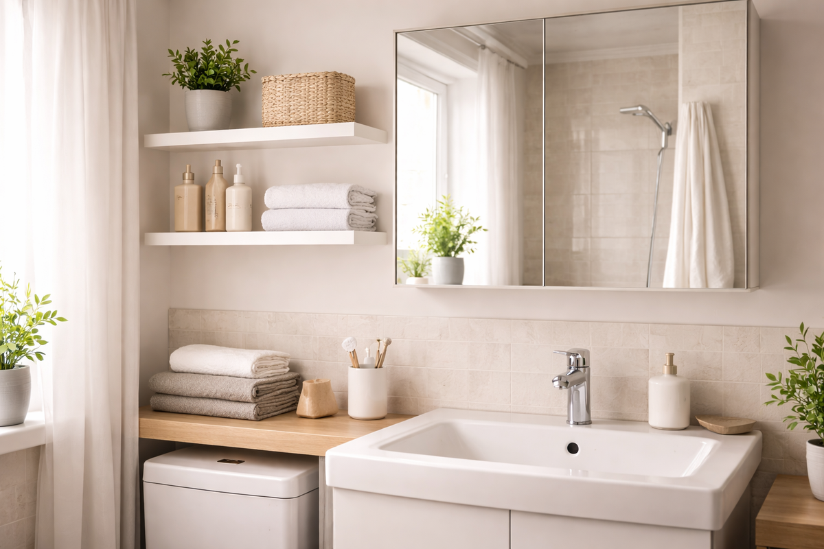 Промпт: Photorealistic small bathroom, clean and organized. White shelves with minimal items — a few bottles neatly arranged, a plant, folded towels. Soft natural light, warm neutral tones, no people, no text, interior photography 16:9.