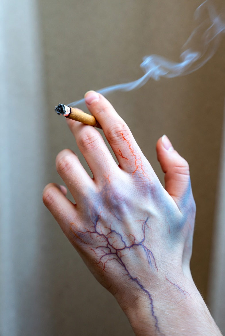 Никотин — это мощнейший стимулятор. Когда вы затягиваетесь, никотин попадает в кровь и заставляет надпочечники выбрасывать адреналин. Адреналин вызывает резкий спазм (сужение) периферических сосудов — тех, что находятся в пальцах рук и ног.