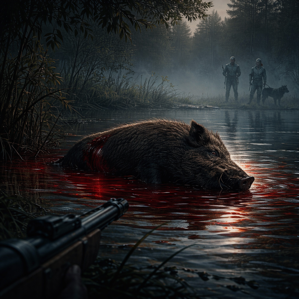 По тропинке, заросшей травой, неуклюже, припадая на искусанную ногу, хромал небольшой кабан. Неподалеку лаяла собака. Вепрь постоянно вертел рылом, из раны на боку сочилась кровь. Зверь вышел на песчаный берег, поросший тонкими, молодыми ивами. Измученно хрипя, сделал пару шагов и опустился в прохладную воду озера. Кабан облегчённо захрюкал — он не знал, что на него направили дуло карабина. Грохнул выстрел. Вепрь завопил и, дёрнувшись в конвульсиях, замер. Озёрная гладь окрасилась в багрянец.
