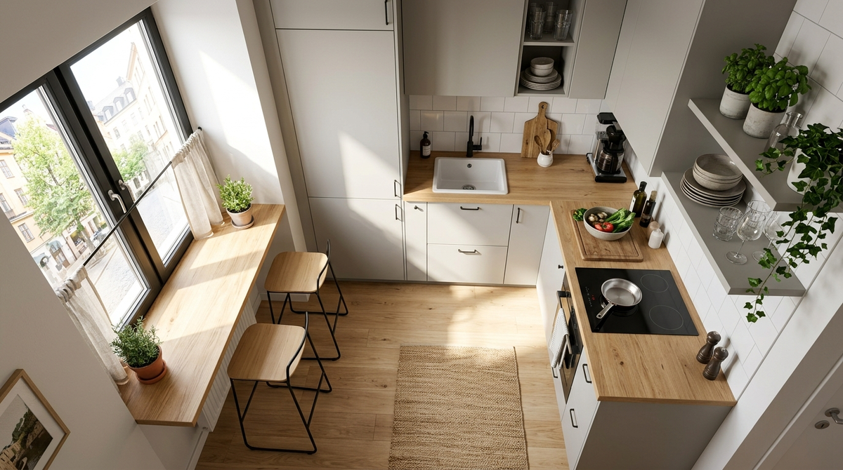 Один из самых популярных приемов — интеграция подоконника. Заменив стандартную пластиковую доску на широкую плиту из искусственного камня или влагостойкого дерева, вы получаете превосходную барную стойку с видом на улицу. Под ней можно разместить узкий радиатор отопления с декоративным экраном.