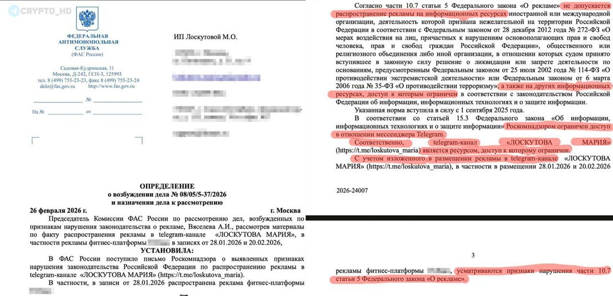 ❌🇷🇺 Реклама в Telegram – вне закона. По данным «Осторожно, новости», ФАС признала рекламу в Telegram нарушением законодательства РФ. Логика простая – закон запрещает рекламу на ресурсах, доступ к которым ограничен в России, а Telegram формально заблокирован Роскомнадзором. Поводом стал конкретный случай: Telegram-канал разместил рекламу фитнес-приложения, все оформил по правилам – договор, маркировка. Роскомнадзор все равно направил материалы в ФАС, где выявили нарушения. Рассмотрение дела – в конце марта. Ответственность грозит всем участникам цепочки: и рекламодателю, и тому, кто публикует интеграцию. При этом до этого момента ни одно ведомство не предупреждало, что реклама в Telegram под запретом. В РКН заявили, что признавать рекламу в Telegram незаконной «это компетенция ФАС». Ранее: - начало апреля - Павел Дуров про уголовное дело - РКН подтвердил ограничения Crypto Headlines