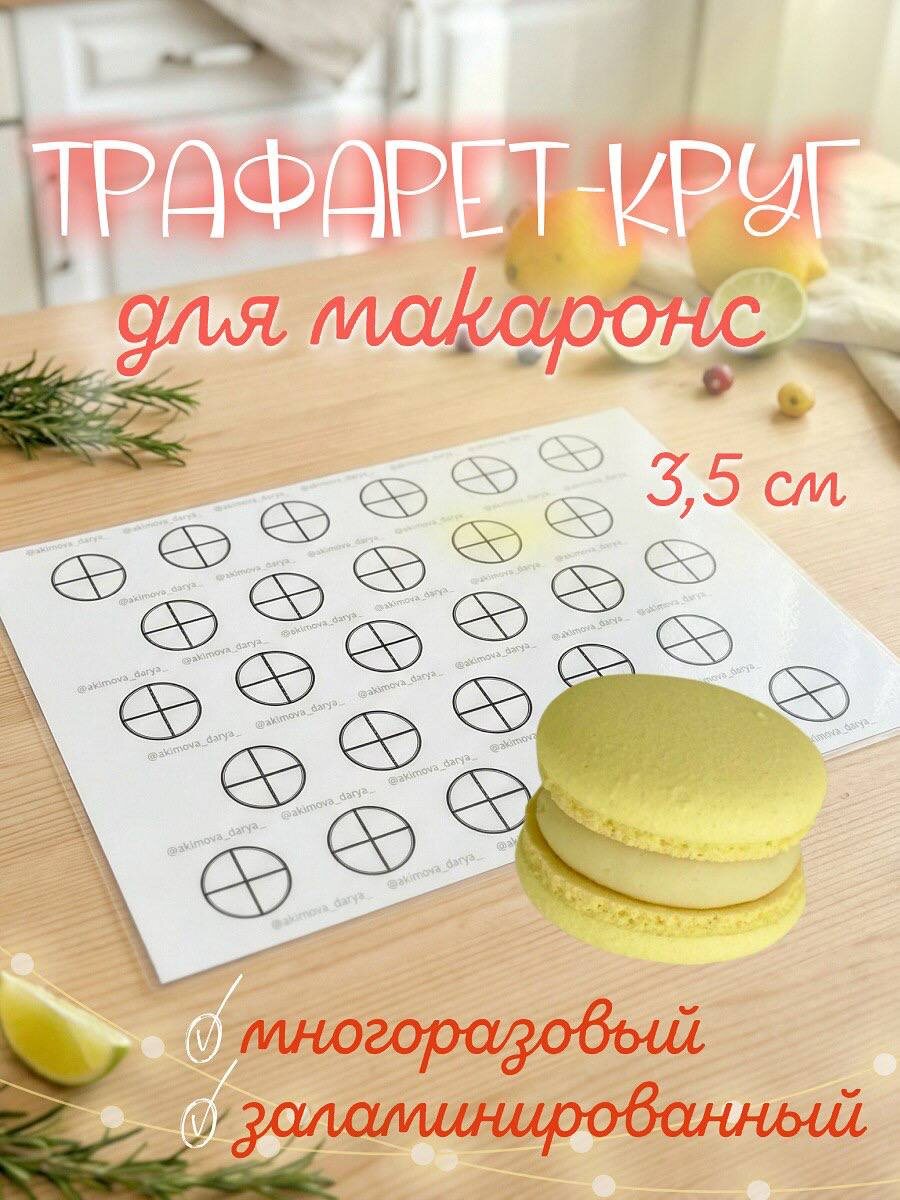 WB 813052233 Трафарет для макаронс круг используется для выпечки пирожных макаронс. Размер самого трафарета 30/40 см, что соответсвует стандартному коврику для выпечки и размеру противня. Трафарет выполнен из бумаги и заламинирован, для более долгосрочного его использования. Для удобства хранения трафарет сворачивается в более компактный размер пополам и составляет размер А4. При этом сгибание трафарета никак не вляет на его целостность. Сами формы круга - 3,5 см, круг выполнен жирной черной линией, так чтобы его было хорошо видно из под коврика для выпечки. Готовые крышечки макаронс после выпечки при использовании этого трафарета получаются 4,5-5,0 см. Это лучший трафарет для удобства и облегчения вашей работы, созданные шеф-кондитером и преподавателем Акимовой Дарьей. Протестированы многими учениками и показали свое широкое и удобное применение. #трафарет #трафаретдлямакаронс #макаронс #макаронсмосква #обучениемакаронс #макаронсмастеркласс