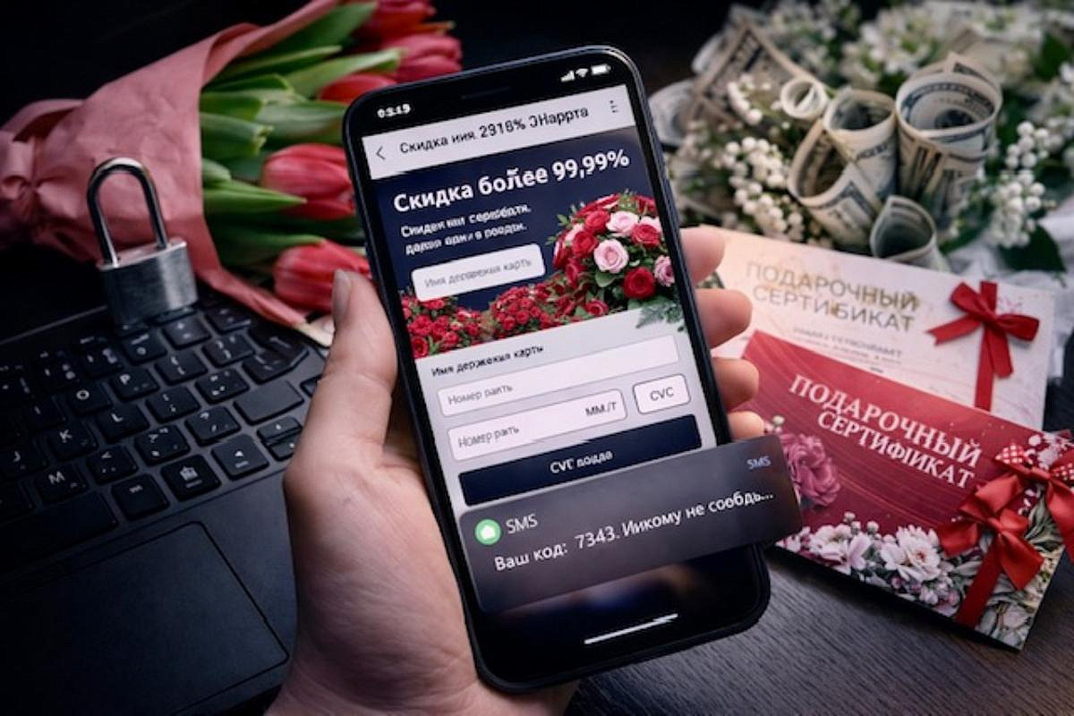 Одна из самых массовых схем — фишинговые сайты с «праздничными скидками» на цветы, подарки и брендовые товары. Пользователю показывают цену