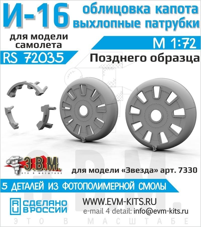 В.М. выпустили облицовку капота позднего образца (с воздухозаборником) для модели И-16 в 1/72 масштабе. Цена: 360₽ Набор предназначен для модели И-16 тип-5. В комплекте облицовка капота - 2 варианта, с закрытыми и открытыми жалюзи радиатора, и выхлопные патрубки из фотополимерной смолы (3D-печать 14К) Набор разработан для пластиковой модели от компании Звезда (арт.7330).