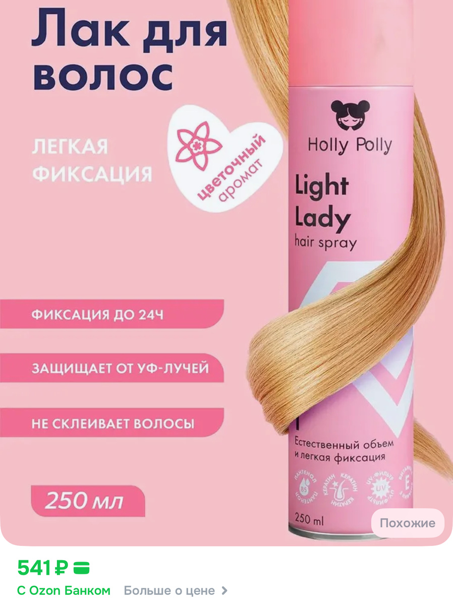 - HOLLY POLLY light lady - лак легкой фиксации, идеален для пышных причесок. Легко фиксирует волосы без склеивания.