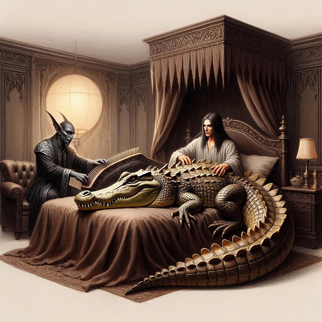 Большой круглый светильник мягко освещает роскошную спальню Саллоса. Массивная кровать с тёмно-коричневыми шёлковыми покрывалами доминирует в центре комнаты. На краю постели, вытянувшись во всю длину, лежит гигантский крокодил Саллиэль, сверкающий бронзовыми чешуйками в свете лампы.