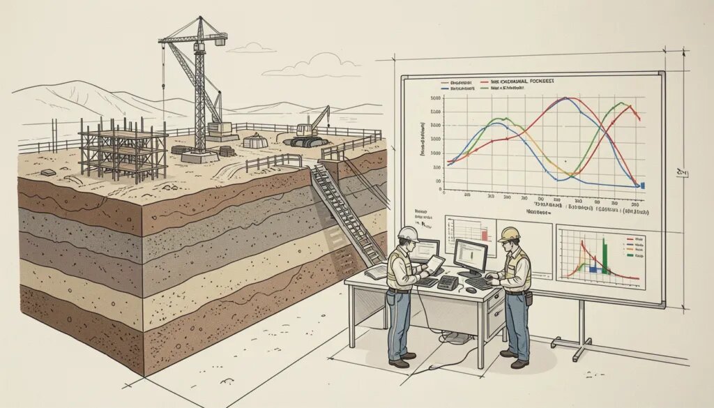 Геотехнический прогноз — это инженерная услуга, направленная на оценку влияния будущего строительства или реконструкции на состояние грунтового массива, оснований соседних зданий и сооружений. Он определяет изменения напряжённо-деформированного состояния грунта, зоны влияния строительных работ и потенциальные риски для окружающих объектов, что особенно важно на плотнозастроенных территориях и при сложных инженерных условиях. Комплекс геотехнического прогноза выполняется инженерами-геологами и геотехниками и обычно включает математическое моделирование, анализ исходных данных, обследование состояния существующих сооружений и расчетные работы с применением специализированных программных комплексов (например, PLAXIS). Инженерные изыскания — это широкая категория полевых и лабораторных работ, включающая бурение, отбор проб грунта, лабораторные испытания, определение уровня грунтовых вод, геофизические исследования и составление инженерно-геологических отчетов. Их цель — получить фактически