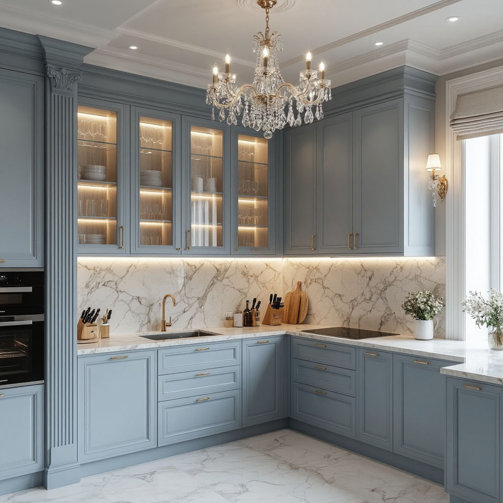 Ошибка: вешать классические «дворцовые» люстры на натяжной потолок в маленькой кухне. В неоклассике свет должен быть современным: трековые системы, геометричные подвесы, встроенные споты.
