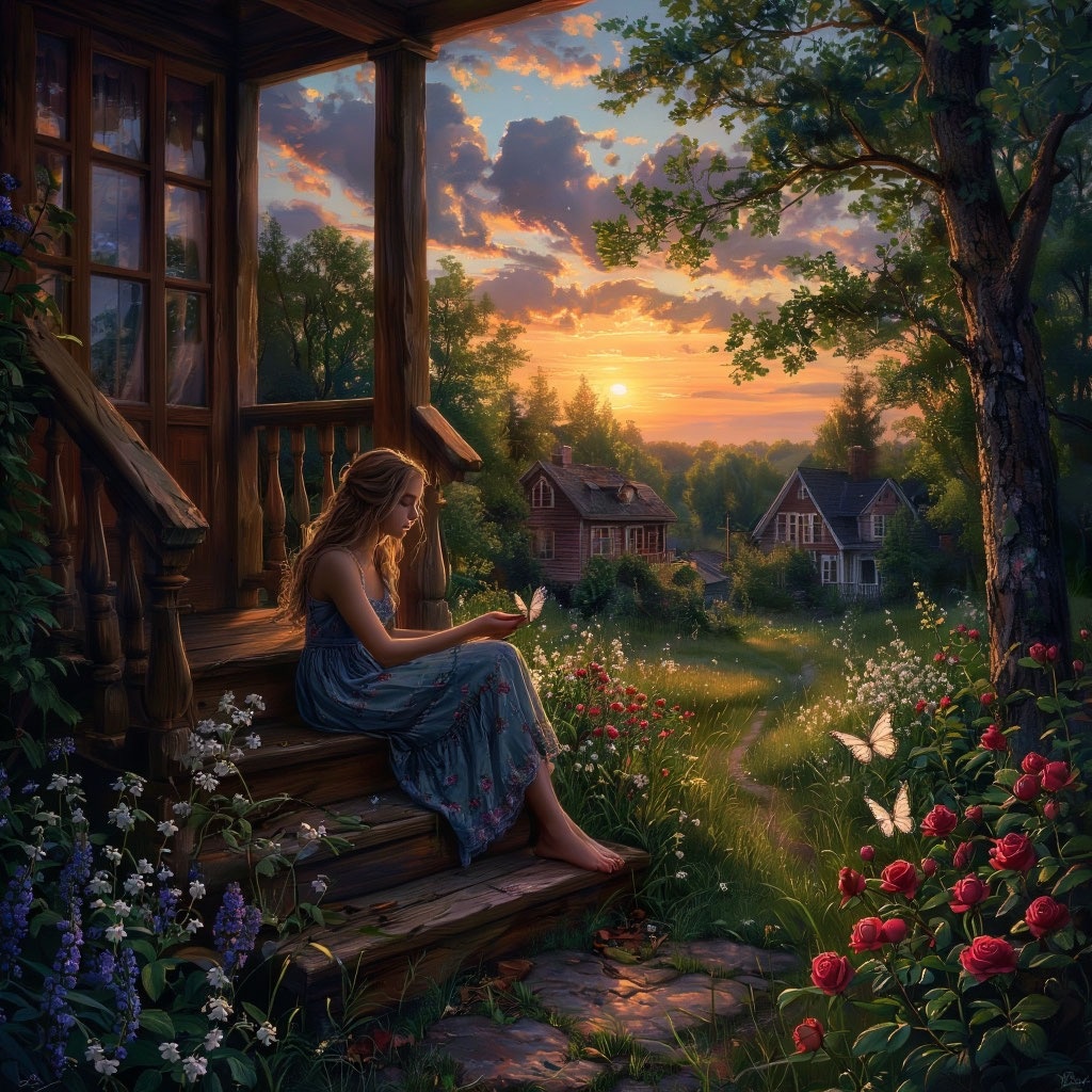 Как-то поднявшись поутру, девушка пристроилась на крылечке полюбоваться знакомыми просторами, полениться немножко, повспоминать. Солнышко вставало далеко за лесом, нежными красками румянило облака, лес пел голосами ранних птиц, дышал терпкостью смолы, хрупкостью ландышей, нежностью шиповникового цвета.